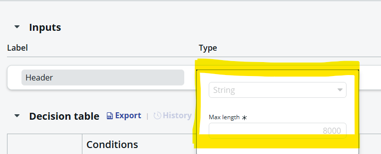 I’ve designed a decision table to evaluate certain conditions based on the email headers received in sys_email. The Headers field in sys_email is an OOB string field with a maximum length of 8000 characters. I replicated this configuration for the decision table input so that it would accept the same header value.