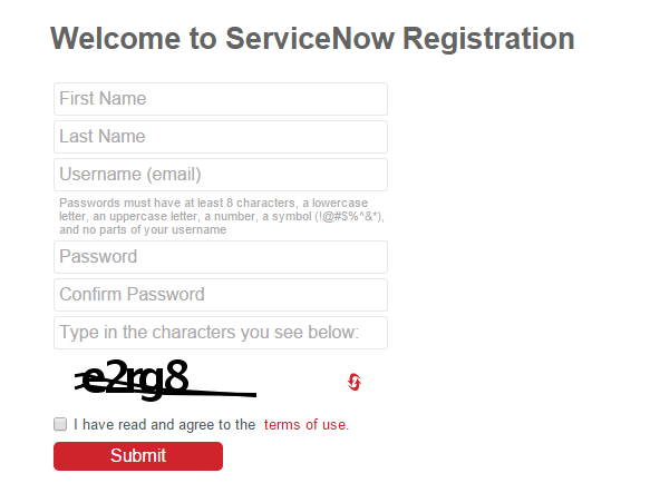 Enter all the required fields. You should receive an email from ServiceNow Community to validate your email address. Follow the instructions in the email to complete a short registration.