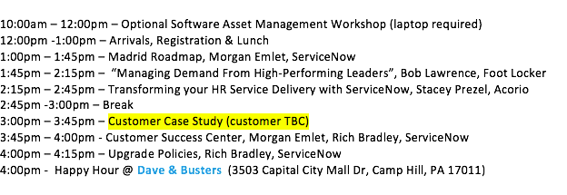 We're still looking for one more customer to present at the upcoming Central PA SNUG on Monday, March 11th. Please reach out to caterine.alvarenga@servicenow.com if you are interested in presenting your ServiceNow case study.