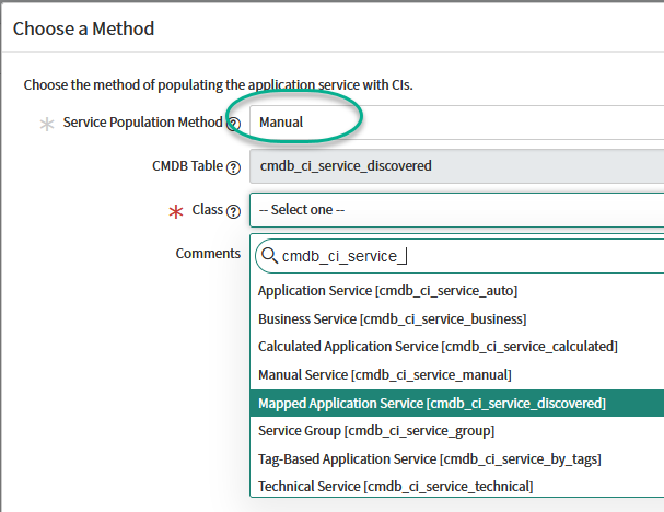 - Choose manual population method, and filter the class to find the other app service you want to to be dependent on. In my case I am making my empty app service dependent on a Service-Mapped app service which represents the platform host. My new app service is a dummy 'module'