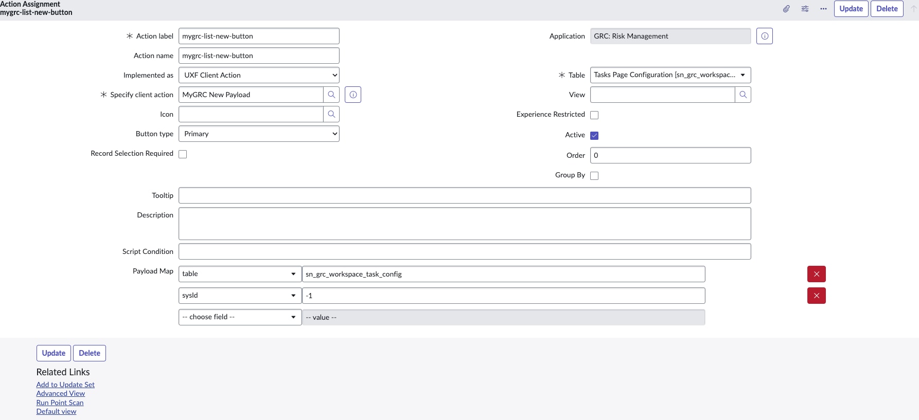 1. Created a Declarative Action (List Action) for the table sn_grc_workspace_task_config with the following Payload Map: