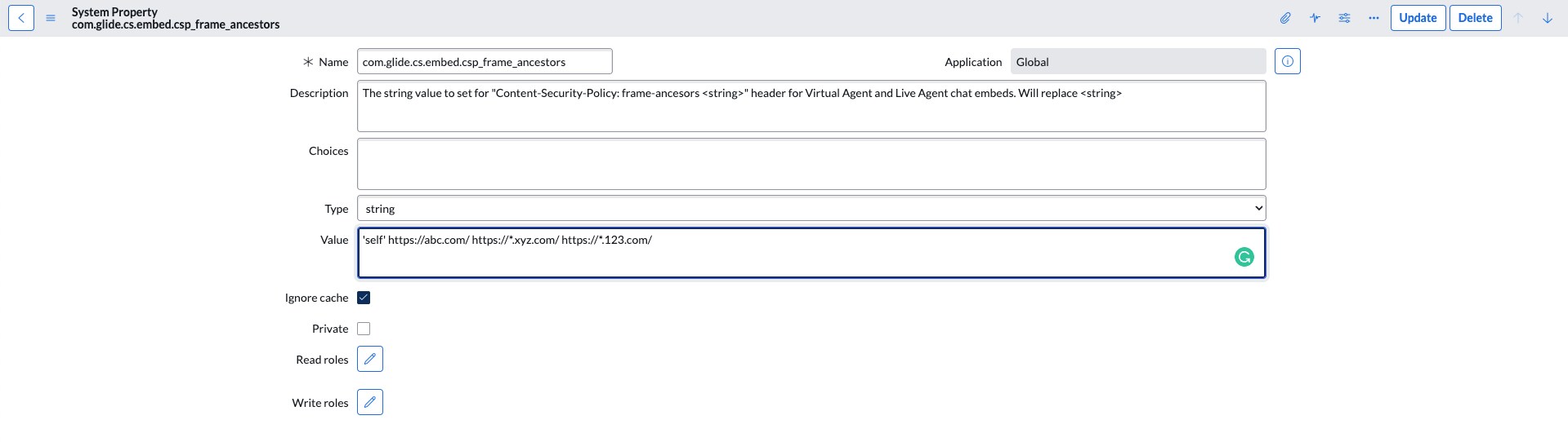 example value for com.glide.cs.embed.csp_frame_ancestors = 'self' https://*.abc.com/ https://*.xyz.com/ https://*.123.com/