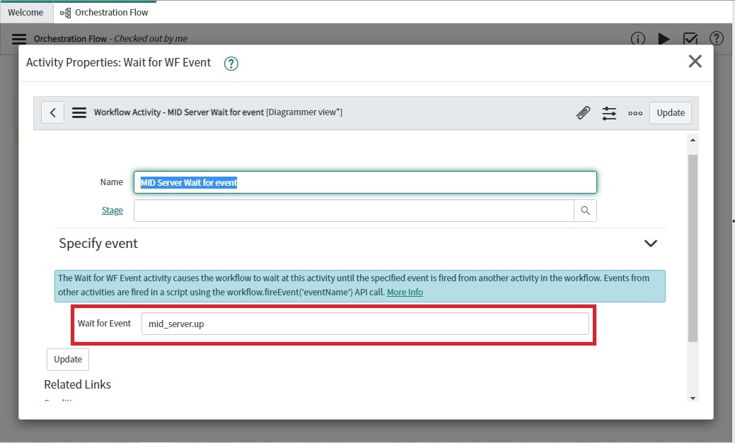 This Wait for Workflow Event Activity is again connected back to the IF activity to check if our required MID server is UP or is it some other MID server.