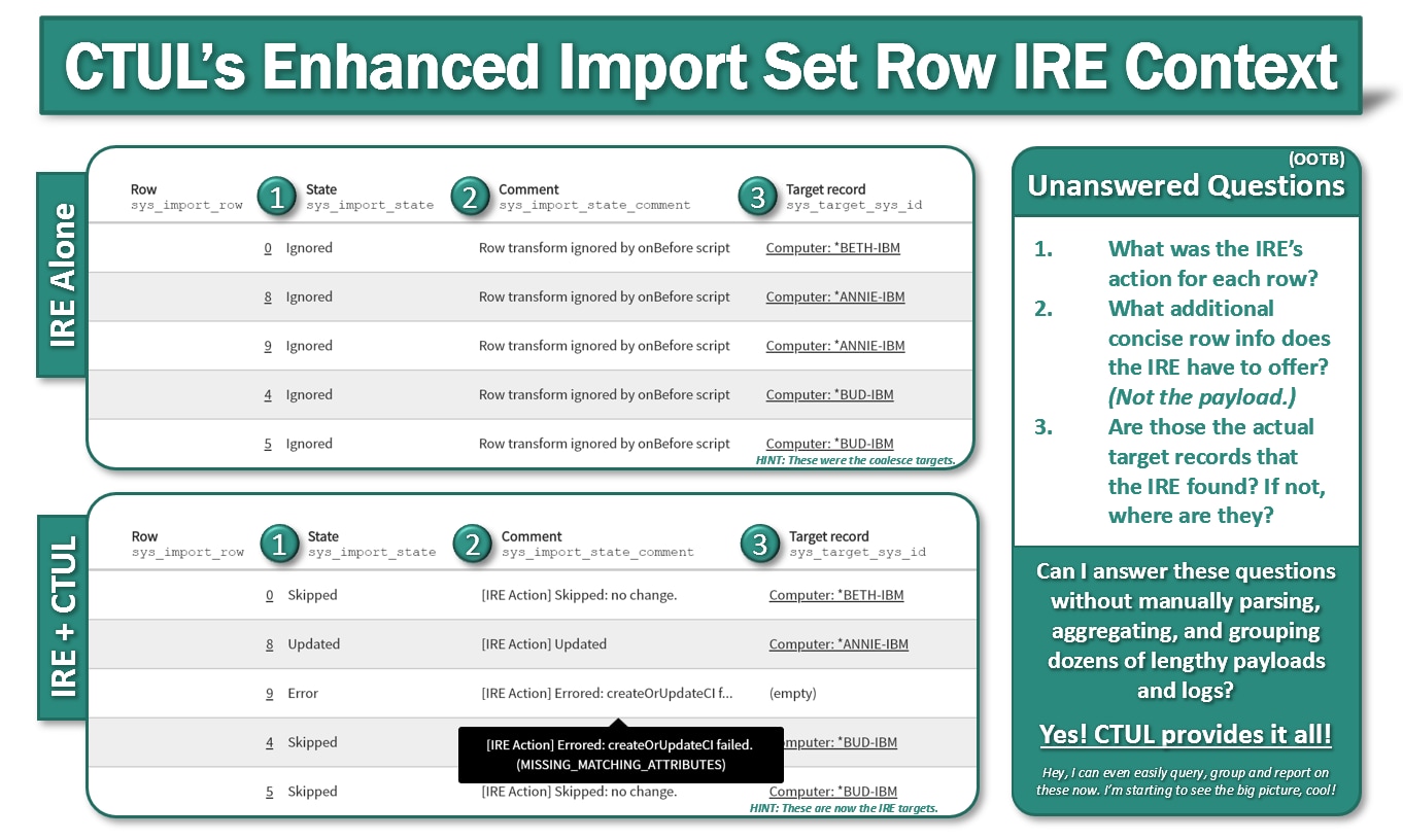 CTUL makes the import set rows themselves - rather than verbose import logs - become a very powerful troubleshooting and analytical resource. This is especially helped along by the fact that the import set row records are, by nature, easier to query and group by than the message column of the import logs.