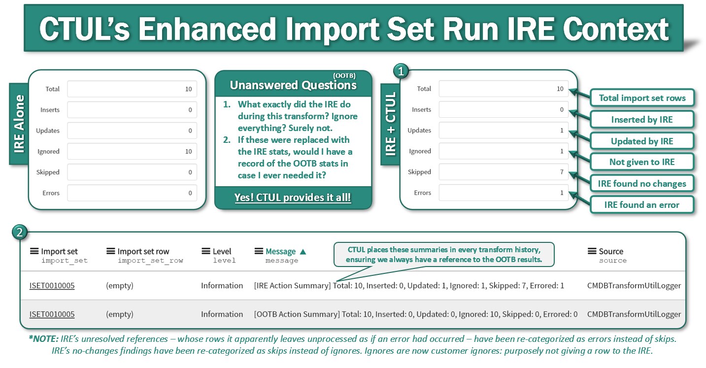 This utility enhances the audit trail left behind by transform map IRE integrations in order to hopefully make analyzing and troubleshooting the IRE results more intuitive, informed, and empowering. This is accomplished by linking import set rows to their IRE outcomes and by repurposing the transform history stats to reflect the five potential IRE results rather than just an across-the-board ignored count. By bringing all the context - both the raw data and a concise summary of the IRE's findings - into the same picture, an informed analysis and understanding is more easily obtained.