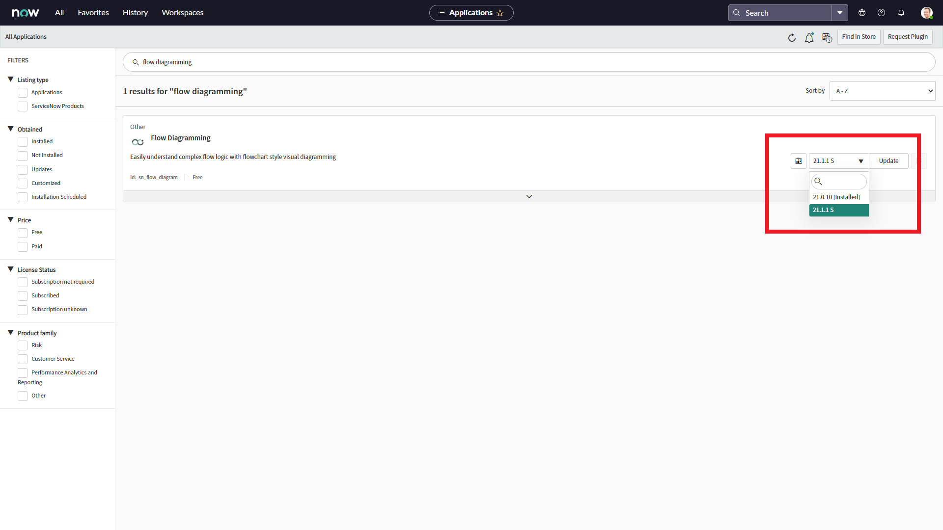 So let's have a look at the Plugins, and search for Flow Diagramming. Although it's a new plugin that comes with the San Diego release, there's already a new version available: 21.1.1 S. This is actually also the "trick" for getting Flow Diagramming activated!