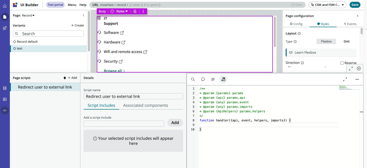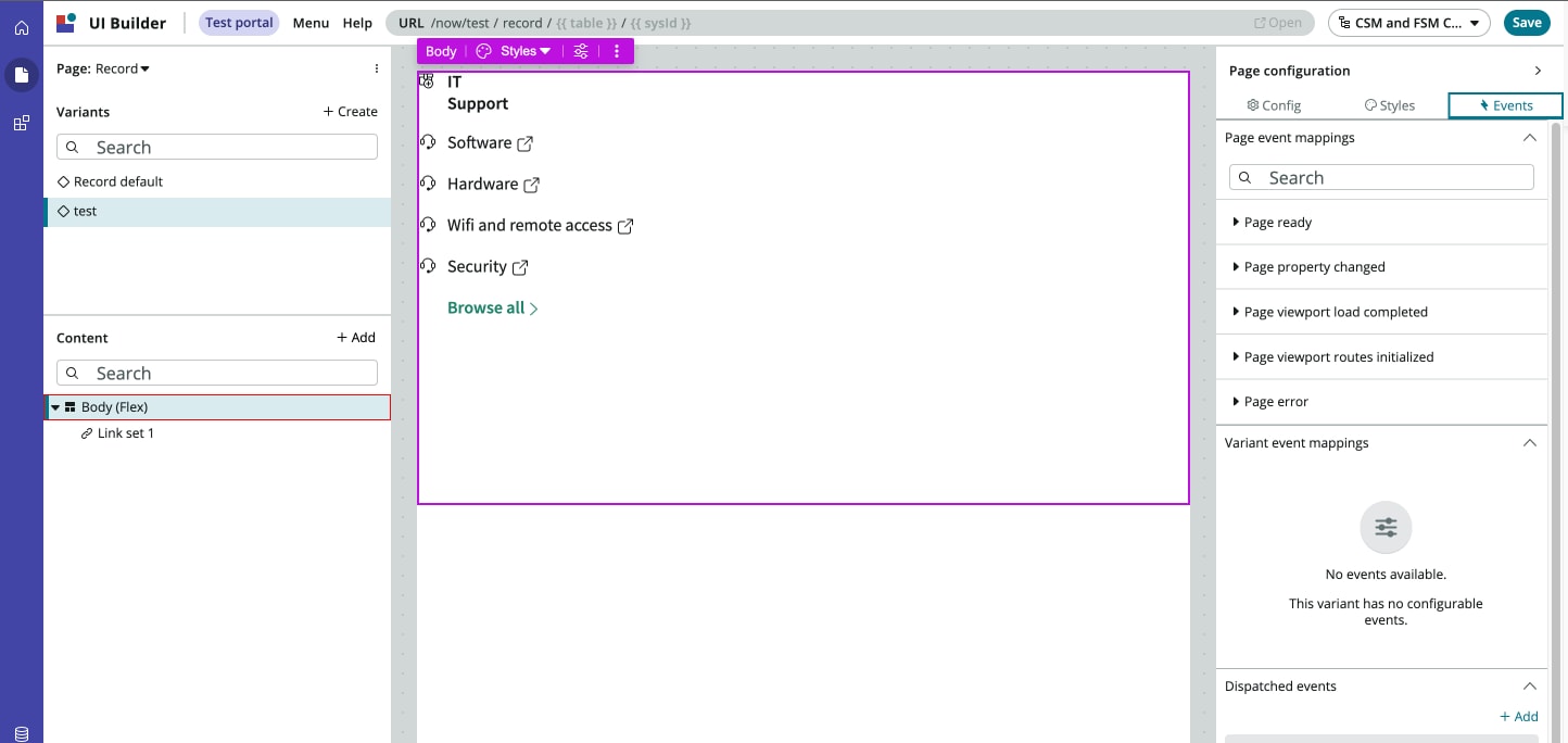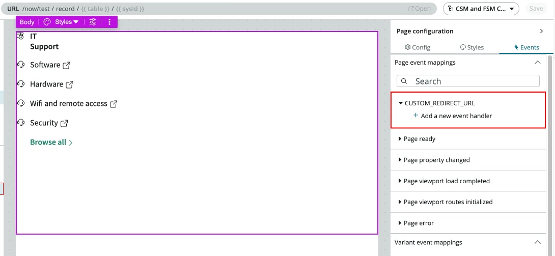 function handler({api, event, helpers, imports}) { const uri = 'https://www.servicenow.com/'; api.emit('CUSTOM_REDIRECT_URL', {url: uri}); } - Now this event has to be handled on the page. This will tell the application what to do when this event is fired. To do this go to the Body of your page layout and navigate to events: