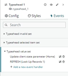 3.Still at the typeahead search component’s events -> typeahead value set -> add „REFRESH (Look Up Records 1)” after the „Update client state parameter”