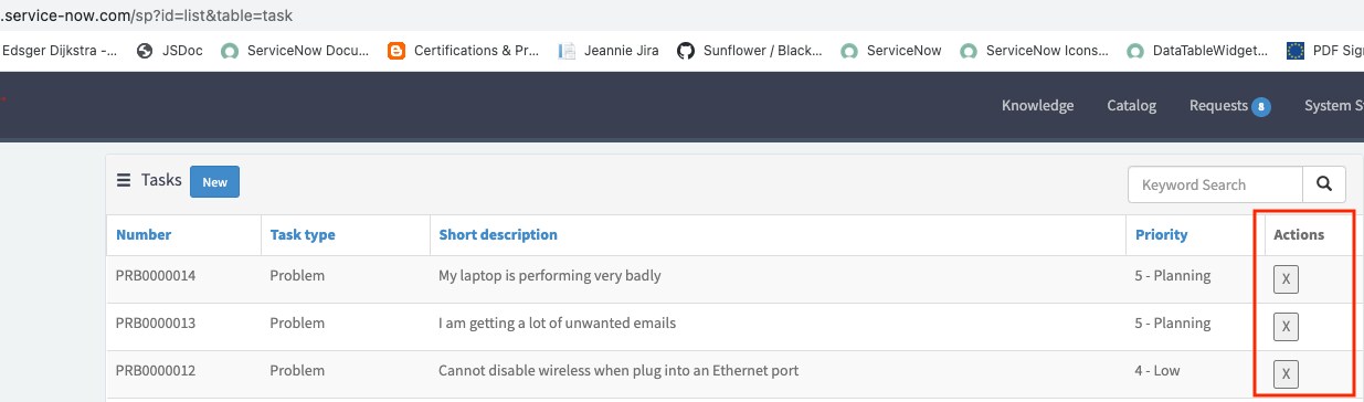 Client controller:api.controller=function($compile) { /* widget controller */ var c = this; c.click = function (item) { /* item has the following structure (number, priority, short_description depend on what you selected as fields in the instance options): { sys_id: '<Sys ID of the item>', targetTable: '<table name of the item>', number: { display_value: "INC00000XYZ" label: "Number" limit: "40" type: "string" value: "INC00000XYZ" }, priority: { display_value: "5 - Planning", label: "Priority", limit: "40", type: "integer", value: "5" }, short_description: { display_value: "My Short Description", label: "Short description", type: "string", value: "My Short Description" } } */ if (item.number.value == 'INC0000001') { alert('INC0000001'); } }; c.init = function (tableElement) { var tableScope = tableElement.scope(); tableScope.click = c.click.bind(c); var template = tableScope.widget.template .replace('</th>', '</th><th>Actions</th>') .replace('</td>', '</td><td ng-class="{selected: item.selected}"><button ng-click="click(item)">X</button></td>'); tableElement.html(template); $compile(tableElement.contents())(tableScope); }; };