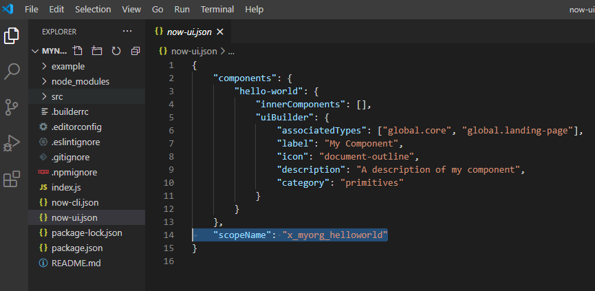 - scope: ServiceNow scope name to be assigned to this project and its components. If scope is not provided, the Now CLI will default the scope name to x_<vendor_prefix>_<package_name>