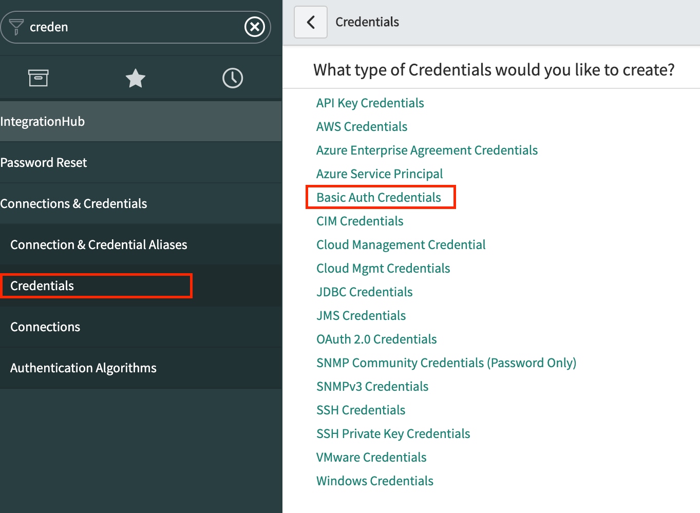 To make the connection to a Git repository via the MID server, you need to create a Git credentials record on the ServiceNow instance. For an https connection, create a Basic Auth Credential. From the navigator, search and select "Credentials", click on the "New" button, and pick "Basic Auth Credentials".