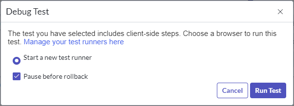 "Pause a test to troubleshoot failures or unexpected behavior by adding a breakpoint for a particular test step. You can now also pause before rollback at the end of the test."