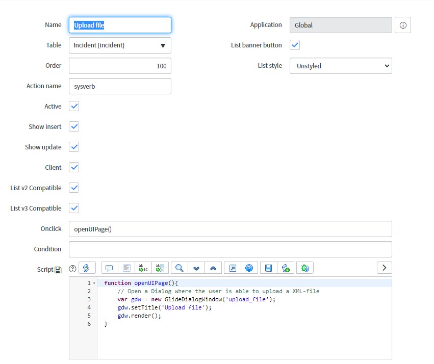 Identical user experience, but now with a configurable and reusable UI page. I have attached an update set with the code as: "Upload File Example - with injection.xml"