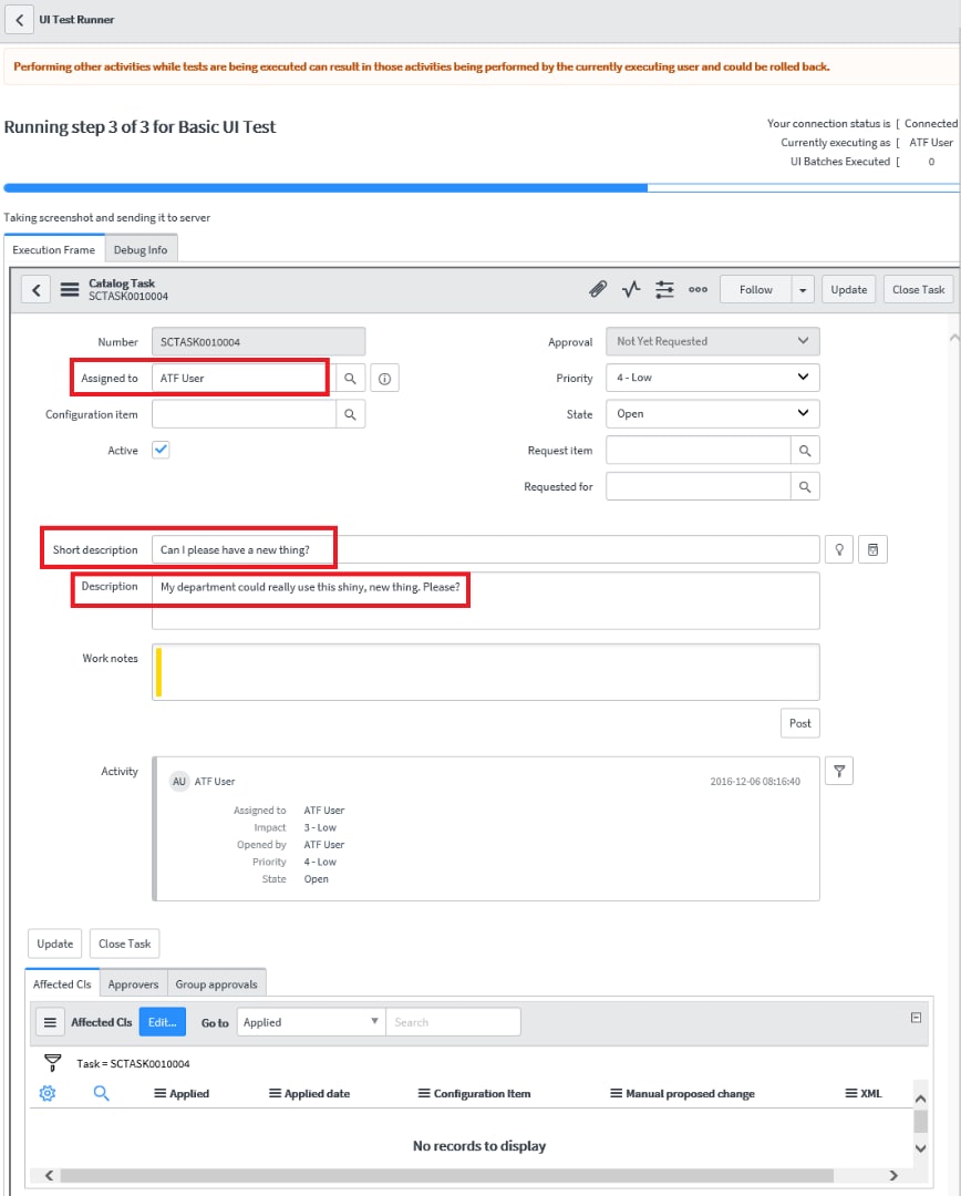 After logging in with the atf_test_designer role (not impersonating since the test runs impersonating another user) using Internet Explorer 11, I chose to run the simplest write test among the demo tests called "Basic UI Test". This test has only four steps, opening a new 'Catalog Task' form, set some fields, and submit. Below is the screenshot of the test: