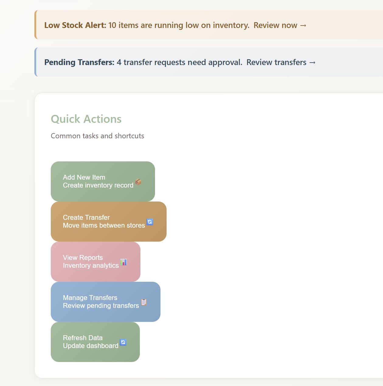 Dashboard Overview: Real-time stats for items, stock alerts, and transfers