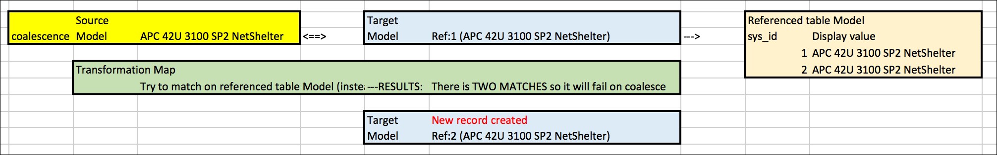 You can map more than the display value of the reference field by using "referenced value field name" | If some of the coalesce fields data holds very limited values (e.g. choice field) and the target table is very large, the query could be slow. e.g. you add impact as part of you coalesce fields, and your target table is incident. There is a case where query could be "select ... from incident where impact = 1" which could be a large query if you have a large incident table. | |