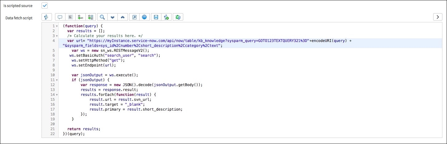 Let's start with the data fetch script. Once you click the "Is scripted source" checkbox on the search source form this field is displayed. This is where you'll setup the search request for your external site. For this example, we're going to use the ServiceNow table api. This part will vary greatly depending on the application you're querying.