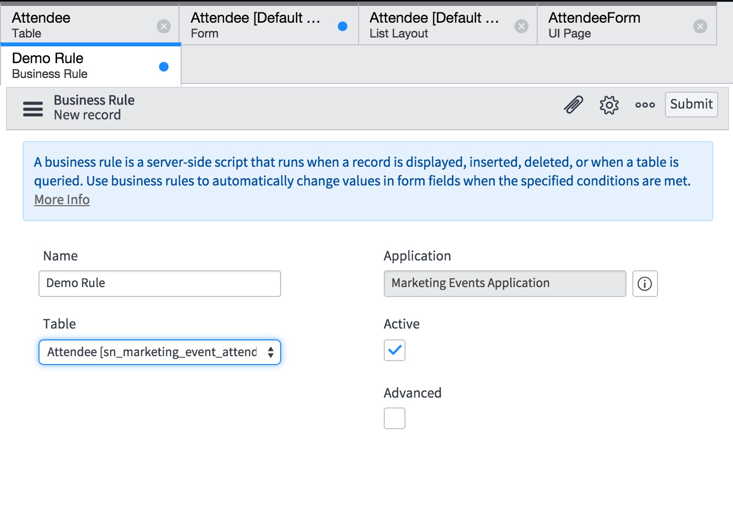 If you edit an application such as the Marketing Events application from the training courses, you will be presented with the new IDE interface.