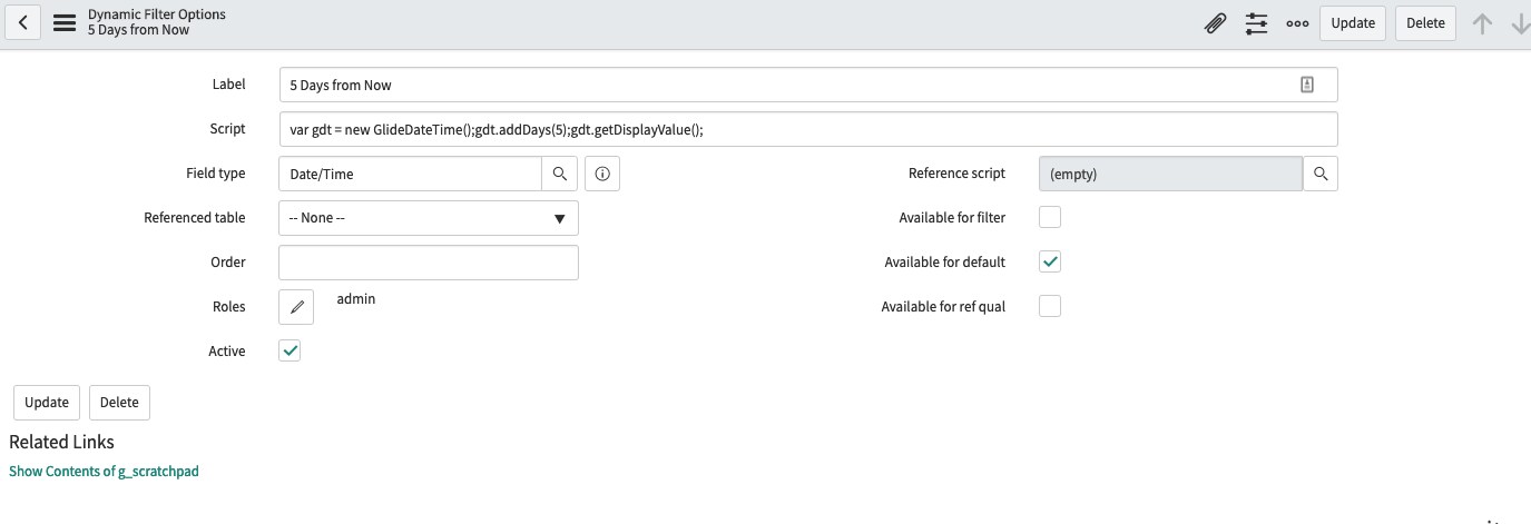 javascript: var gdt = new GlideDateTime();gdt.addDays(5);gdt.getDisplayValue();