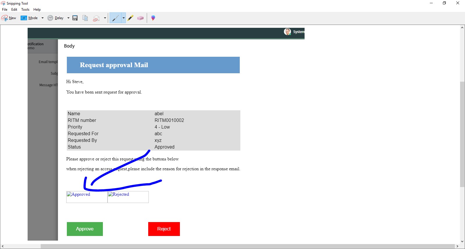 var rejButStr = '<a href="mailto:dev11111@service-now.com?subject=re:' + current.number + ' - reject&body='+ current.number + ' - Reject' +'"><img style="align: baseline;" title="Click this button to mark rejected" src="/rejectButton.pngx" alt="Rejected" width="142" height="41" align="baseline" /></a></div>';