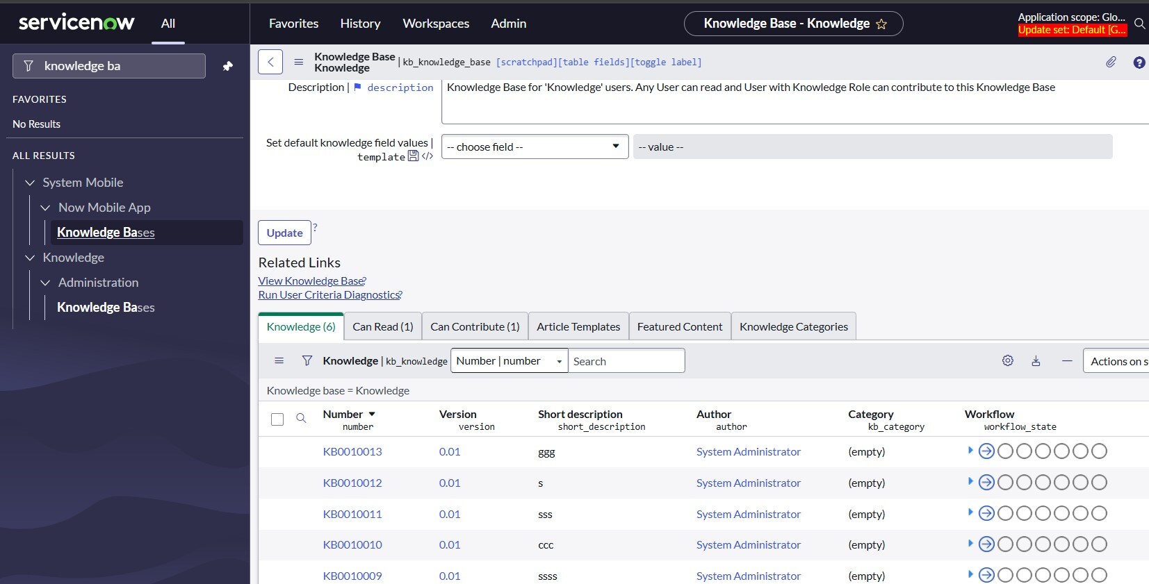 In the Knowledge Base table (kb_knowledge_base.list), we noticed that many Knowledge Requests are being created automatically under the Knowledge Module (kb_knowledge_base.do). For example: KB0010013 (kb_knowledge.do).
