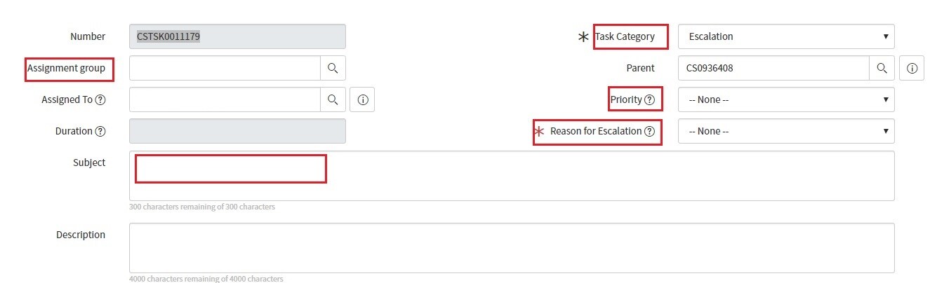 You can similarly assign values to the 'Reason for escalation' and 'Task Category' fields