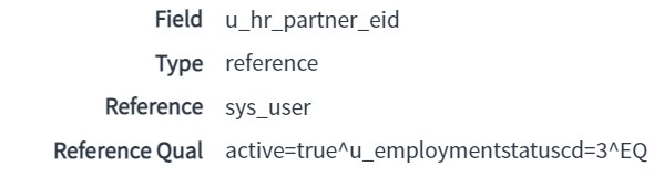 My requirement is to update every month the "HR Partner EID" of the users in a custom table.. I need to reference it in the sys_user table field named "HR People Advisor Name".