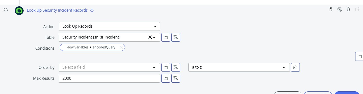 Starting off with a look up records on Security incidents table, and then using it to Set a flow variable - 'encodedQuery'