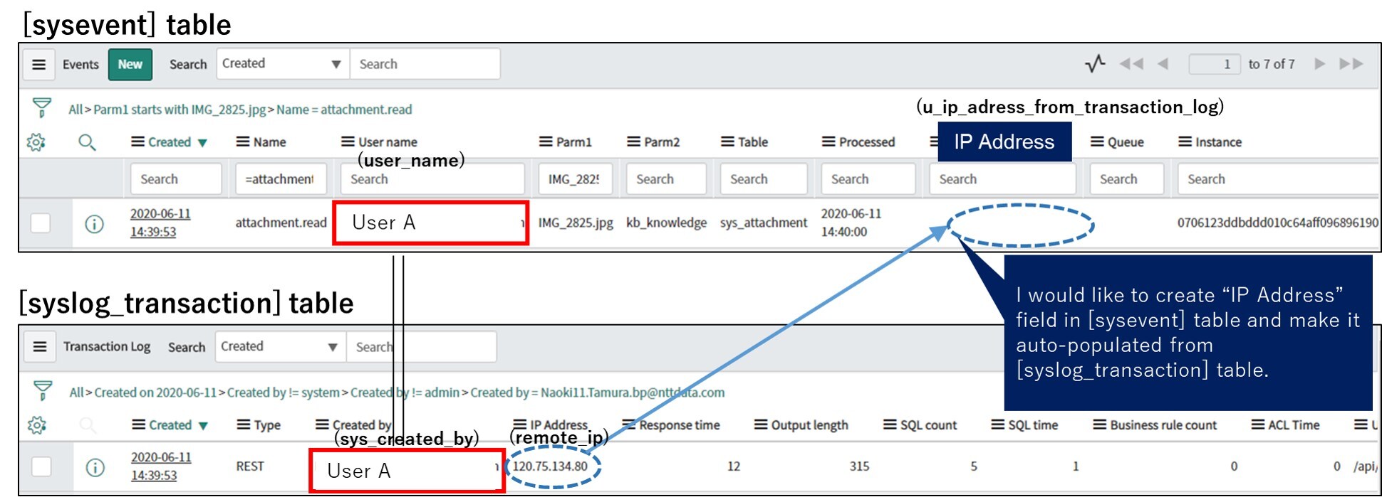 After a record is created in [sysevent] table, the custom field "u_ip_address_from_transaction_log" should be auto-populated by referencing "remote_ip" field in [syslog_transaction] table which has same user name. (Please see the image below)