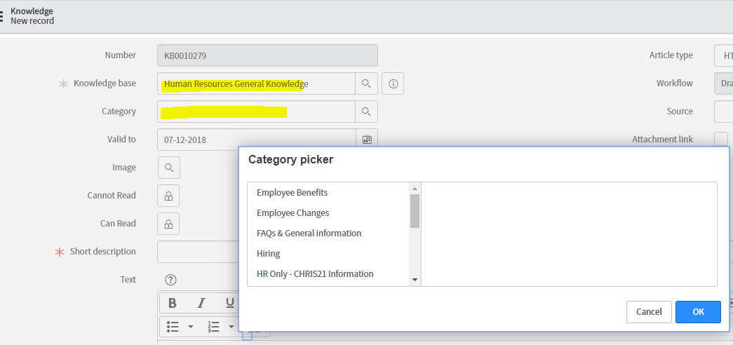I'm facing a problem in the knowledge module: When creating an article I cannot add new categories to it.