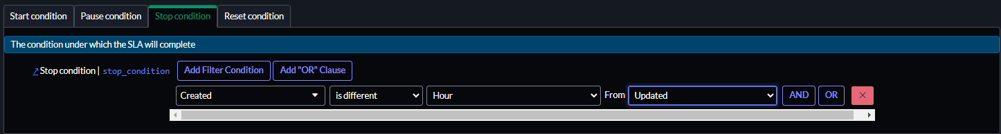 I'm building SLA definitions and in the Stop Condition I want to use "Created is different from Updated".