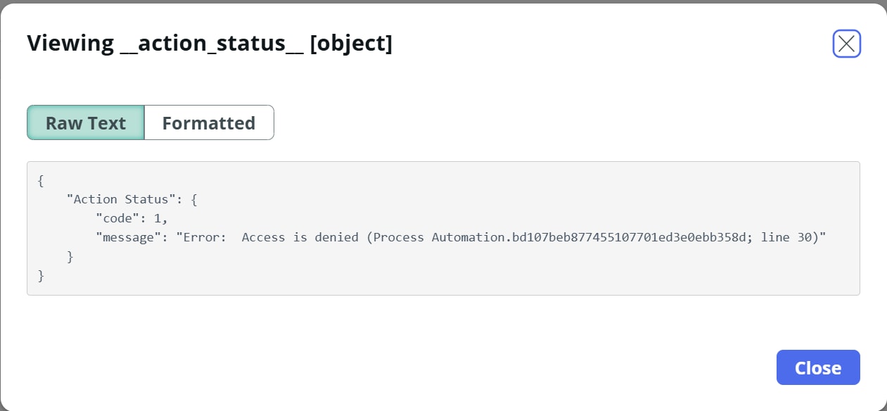 "message": "Error: Access is denied (Process Automation.bd107beb877455107701ed3e0ebb358d; line 30)"I'm not clear as to which script's line 30 is causing a problem.