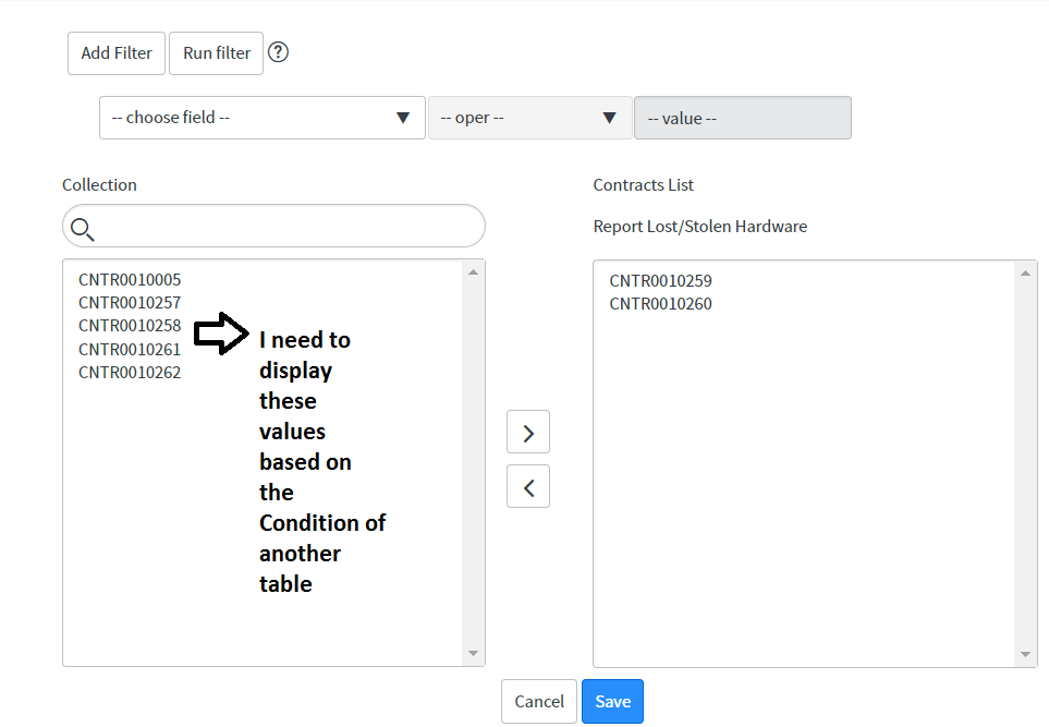 The Values inside the Slush Bucket are comming from say "Contratcs" table. I want to display those contracts inside the slush bucket which has the company same as in SC_Cat_Item. Can you please suggest me which approach i can take to achive this functionlity.