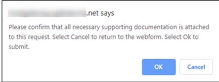 var submit_answer = confirm('Please confirm that all supporting documentation is attached to this request. Select Cancel to return to the form. Select OK to submit.');