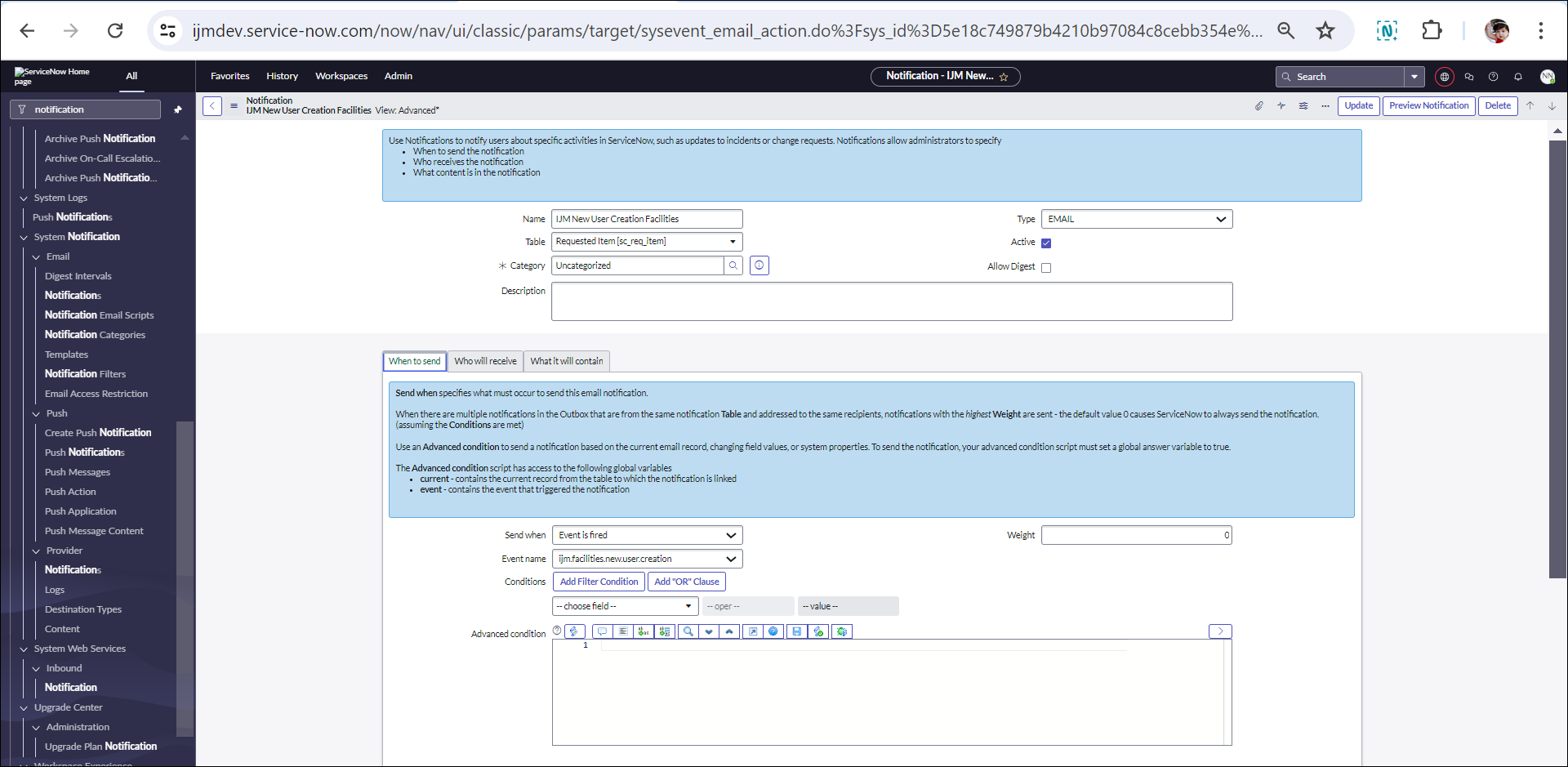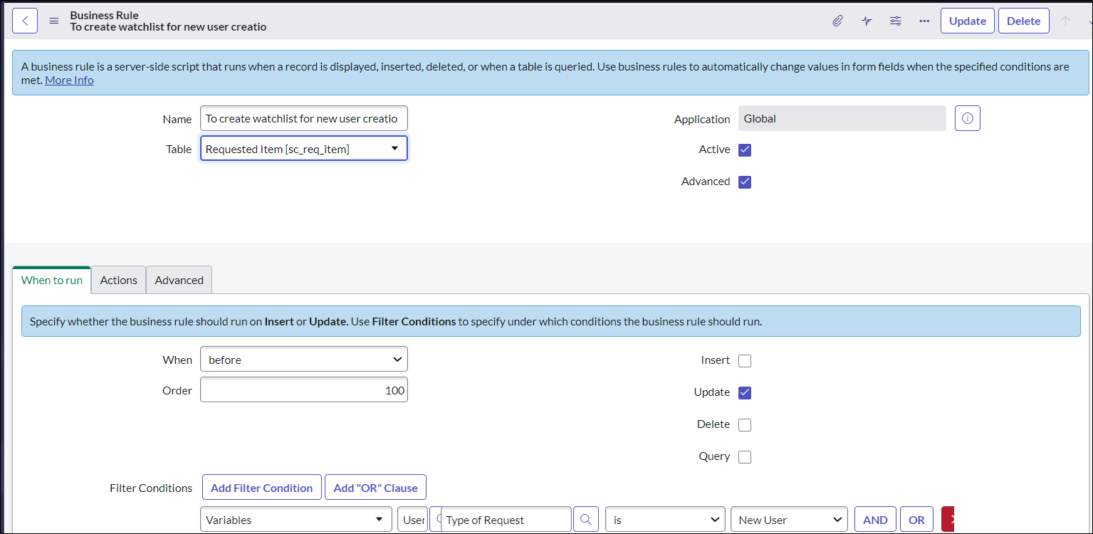 I want to add a watchlist when a particular type of request"New user" of one specific service catalog. I have created a business rule, event, and notification. However, the email notification trigger is not working. Can anyone help me with the code, please?
