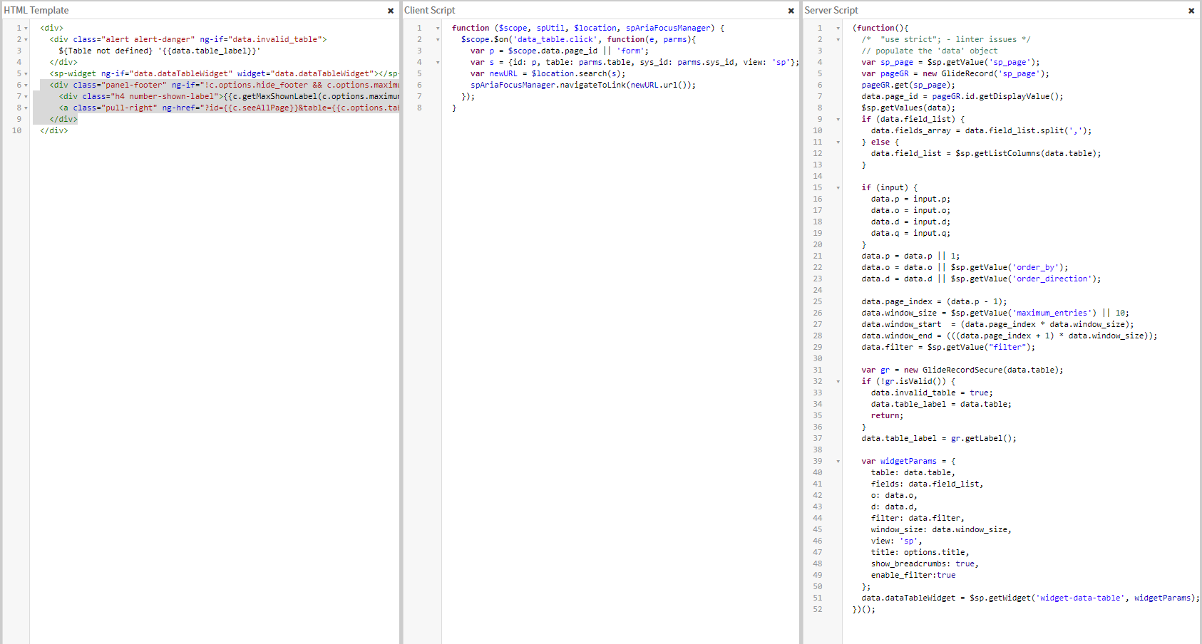 So I am a little new to this but this is what I have so far. I tried adding it to the 'data table filter' widget I created but nothing shows, so I'm pretty sure I am missing some parts to this. Would I have to clone the OOB 'Data Table' widget instead and adjust from there? Also what other parts from the Simple List widget should I get on the scrips to get it to work. I feel as if I am overlooking something simple.