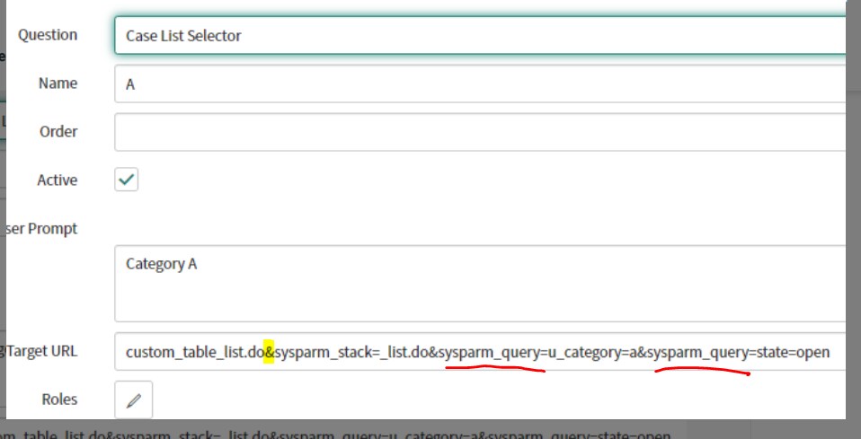 I want to show the records filtered by Category, I tried using sysparm=u_category=a in the target URL, but its not working