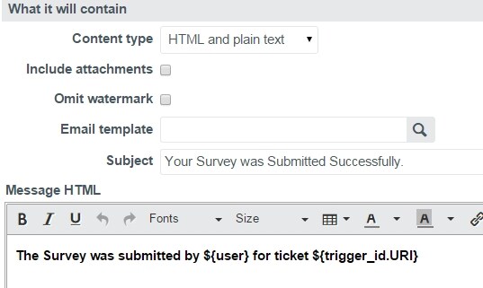 *So and So* has completed a survey based on the original ticket: *Original Ticket that the survey is triggered from is shown* (Use {Trigger_ID})