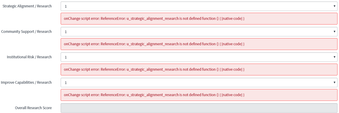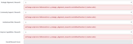 So i created onChange client scripts for each of the following fields like you recommended: Strategic alignment, Community support, Institutional risk, Improve capabilities.