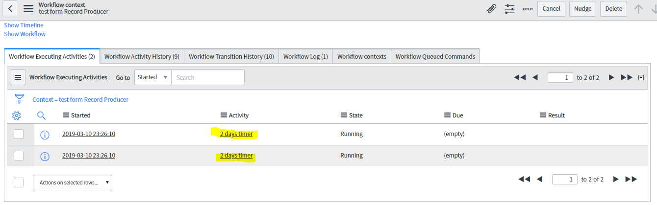 2.There is two timer activity triggered with different sys_id s.After Killing one "Timer", if I try to kill other timer, it shows record not found, though it has different sys_id s. And it triggers the "create event :test for event after timer" activity twice.