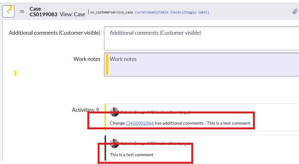 However, I am facing an issue where comments from the CASE are being pushed back to the CASE from the Change Request (PFA). This behavior is triggered by an out-of-the-box (OOB) script include called CSMChangeIntegration.