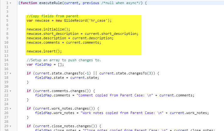 When creating the child hr case is there a way to pull current field values from the parent case into the child. I have tried adding the below code to the beginning of the script you provided (see screenshot below). Question is should/could this be added to the current business rule or should be accomplished with an UI Action or some script. Also, is it possible to copy any attachments on the parent case to the child case? and how to access those, I'm not seeing them on the task table. Finally, is there a way to identify what cases are parent or child cases?