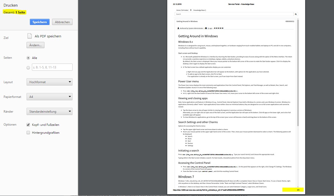 To whom it may concern: when you printing your KB articles in Service Portal you'll face the problem, that only first page is shown in print preview and is printed. Our customers are using the browser printing capability (Ctrl+P).