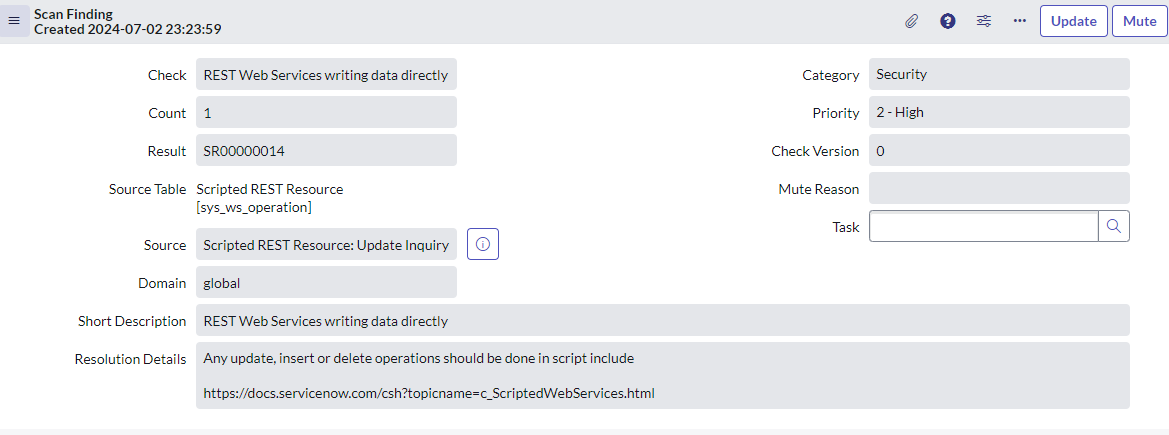 Scan findings "REST Web Services writing data directly" after scanning the update set?