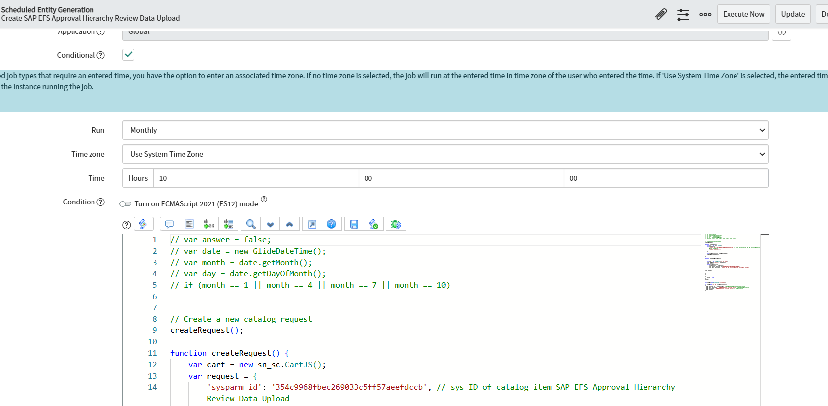 I have created a catalog item that I want to automate the trigger of that catalog item every 3 months. I used scheduled entity generation to automate this and wrote a script to create an REQ and RITM for the same. But the values in REQ like requested for, short description and description are not populating when I execute it using the execute now button present at the bottom left corner. I have the same fields (requested for, short description and description) present on the catalog item as well. I tried to Glide Record as well but values on REQ number generated does not populate. Find the screenshot below for the code.