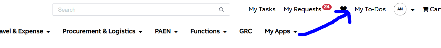 For My App to appear next to To-dos or my requests, you need to add the code in the header menu .If you are using OOB Header menu then it must be Employee Center Header present inside the Theme.