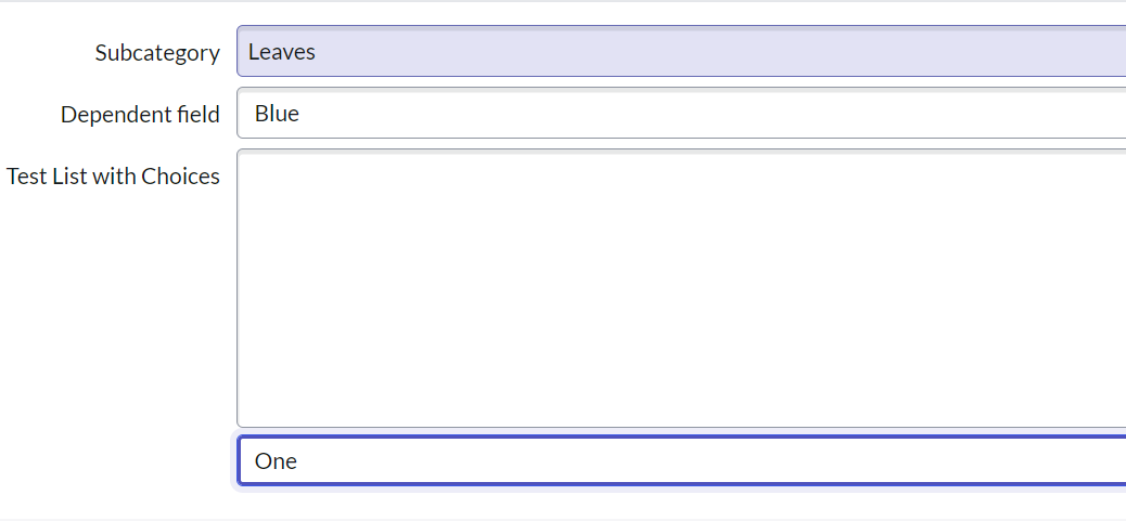 I have a List type field that is set to "Use dependent field" = True. I've set the "Dependent on field"...and then configured choices with the "Dependent value" set.
