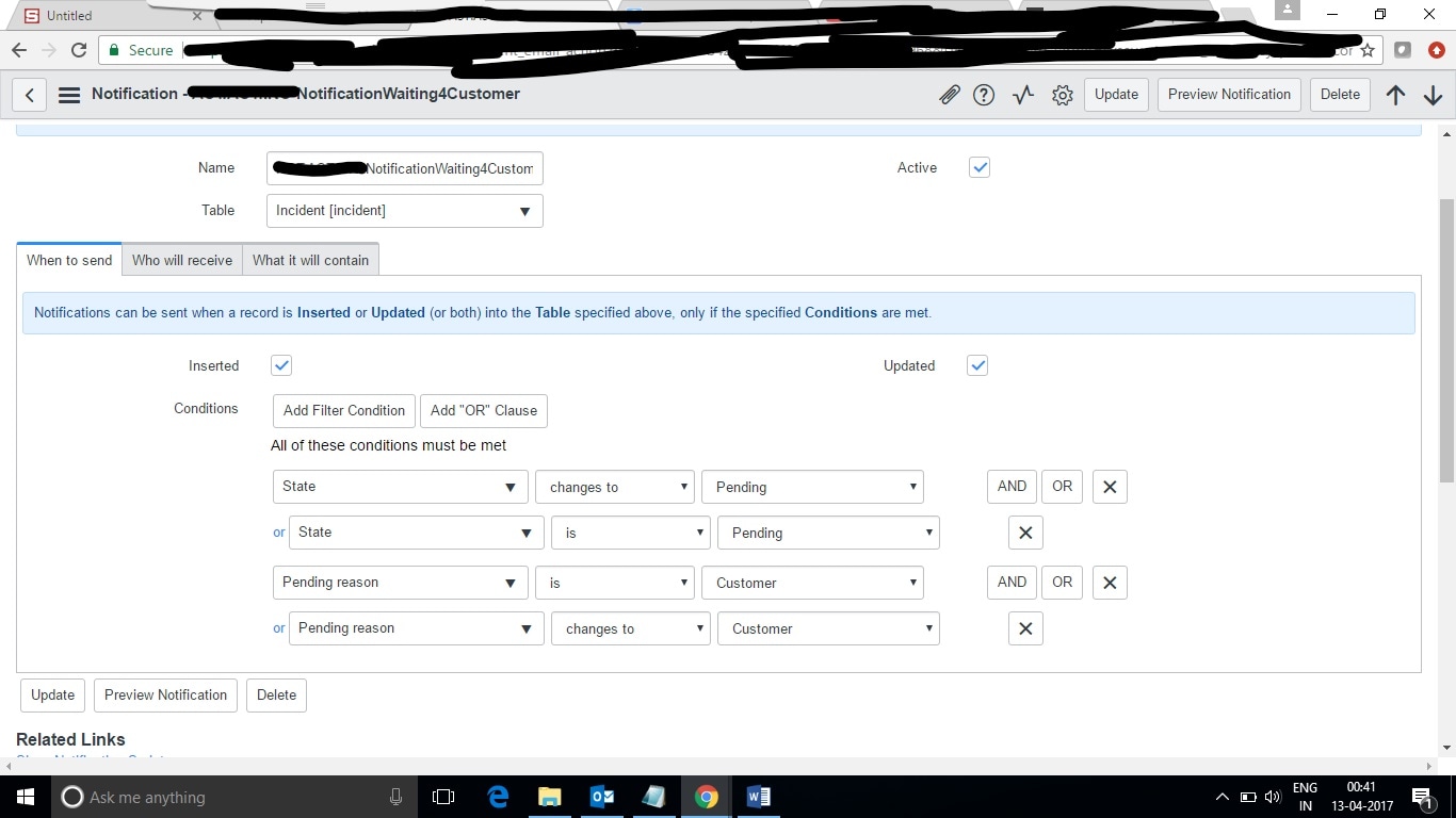 Trying to send a notification when Incident State changes to Pending and Pending Reason changes to Customer