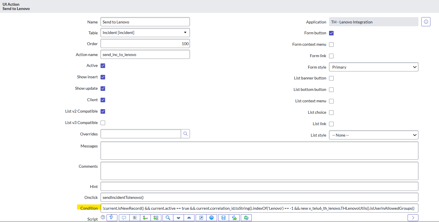 UI Action condition : !current.isNewRecord() && current.active == true && current.correlation_id.toString().indexOf('Lenovo') == -1 && new x_telu6_th_lenovo.THLenovoUtils().isUserInAllowedGroups()