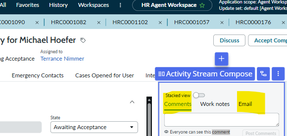 I need some help changing a label in UI Builder for the Agent Workspace. Specifically, I want to update the label in the Activity Stream Compose component where the Email and Comments options appear. The original component is locked because it’s an SNC‑protected macroponent, and even after creating a copy, I’m still unable to modify the label. Where exactly can I find the component that controls these labels, and how can I change them?